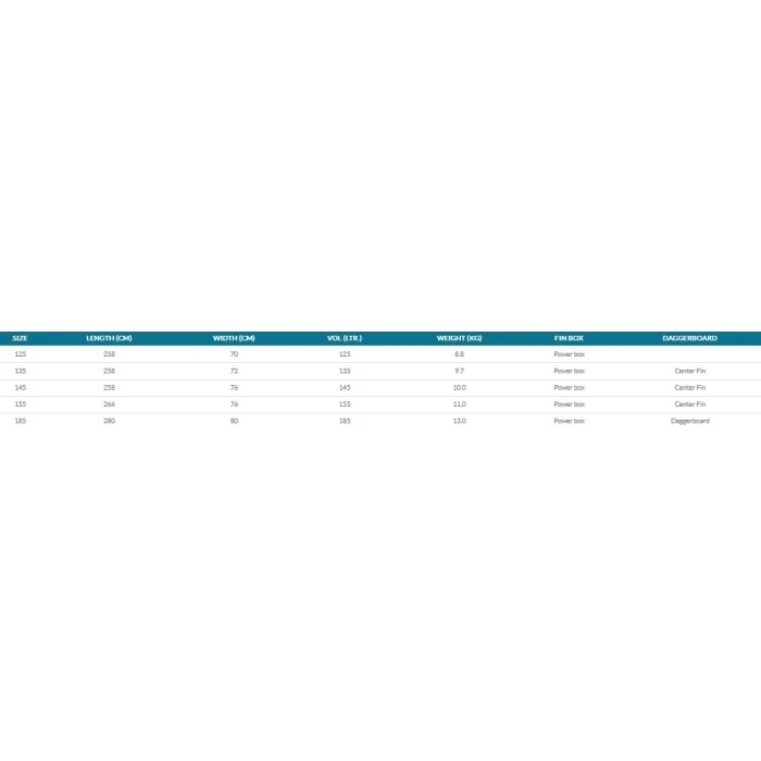 Chaque taille est spécifiquement conçue pour son domaine d’utilisation particulier avec les planches de taille moyenne dotées d’un aileron central en option et le 185 une dérive.